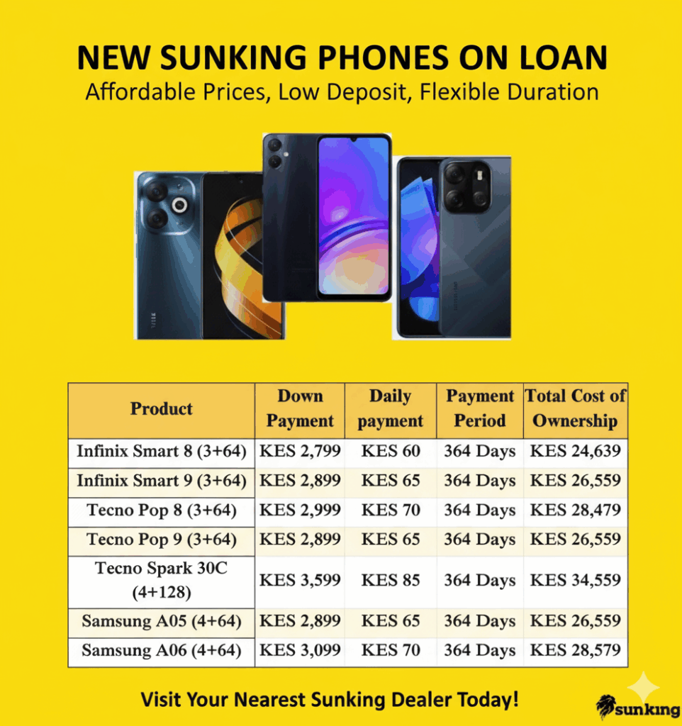 SunKing, a trusted name in solar and pay-as-you-go technology, continues to make smartphones affordable for Kenyans through flexible daily payment plans. With the SunKing Phones on Loan Program, customers can now acquire popular smartphone brands such as Tecno, Samsung, Infinix, and EZ1 by paying a small deposit and manageable daily installments over one year.